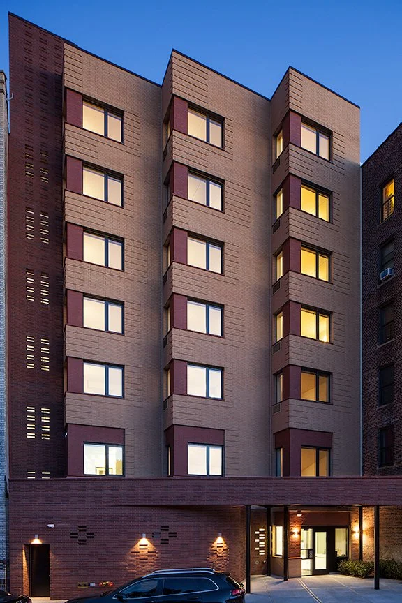 True Colors Bronx (TCBx) is the second housing development from the True Colors Foundation and the West End Residences, furthering the mission of providing supportive housing for formerly homeless LGBT youth in all five New York City boroughs. True Colors Bronx provides independent permanent housing to formerly homeless LGBT youths, many of whom are supporting themselves for the first time. We created a design that ties into the context of the adjacent 1920s apartment buildings to the north and south, setting the base of TCBx to follow the line of the street while the upper floors set back in a rhythm similar to the building to the south. The brick pattern is a modern version of the expressive detailing throughout the neighborhood, including a masonry screen, accent color brick corners, and projecting bands of brick throughout the upper floors.