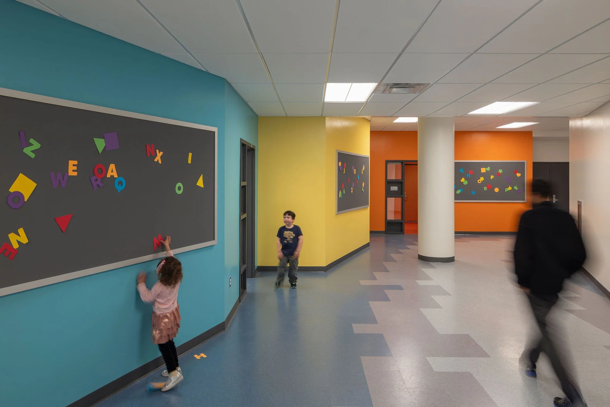With two street exposures within the demised space, the nine (9) classrooms were located at the perimeter of the school’s leased space. While this provided ample daylight for the students, it created a lengthy circulation corridor which inspired the design team to model the interiors as a solar system with nine planet classrooms. Along the corridor pathway, classrooms are painted with colors inspired by NASA’s colorized photographs of our solar system as seen within the Milky Way galaxy. The grand entry lobby serves as the center or sun and sets each little explorer on their way.
